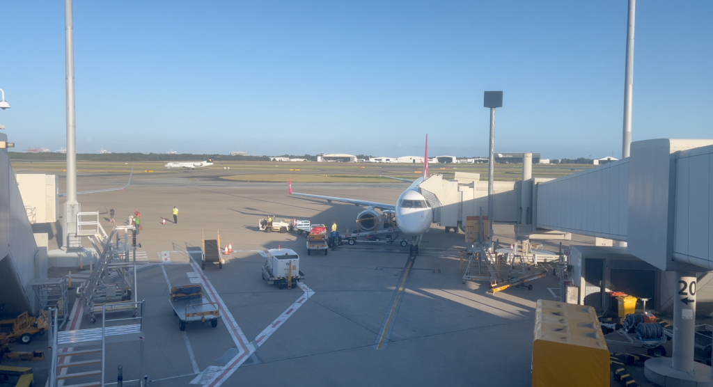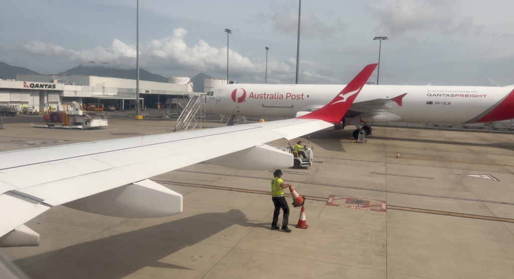 Boarding commenced on time from Gate 22, with a slightly unusual but well-organised process. Passengers walked through a covered walkway before entering the aircraft via an enclosed boarding structure. While not a traditional aerobridge, it provided protection from the intense tropical heat and humidity—an appreciated detail in Cairns’ climate.