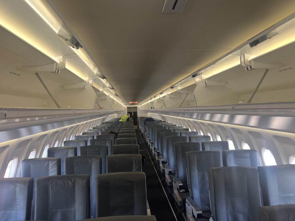 The 2-3 seating layout offers more space per passenger than a 737 or A320, and the seats — though simple — are comfortable for short and medium-haul flights. The aircraft’s age shows only in its retro styling; maintenance standards are immaculate.